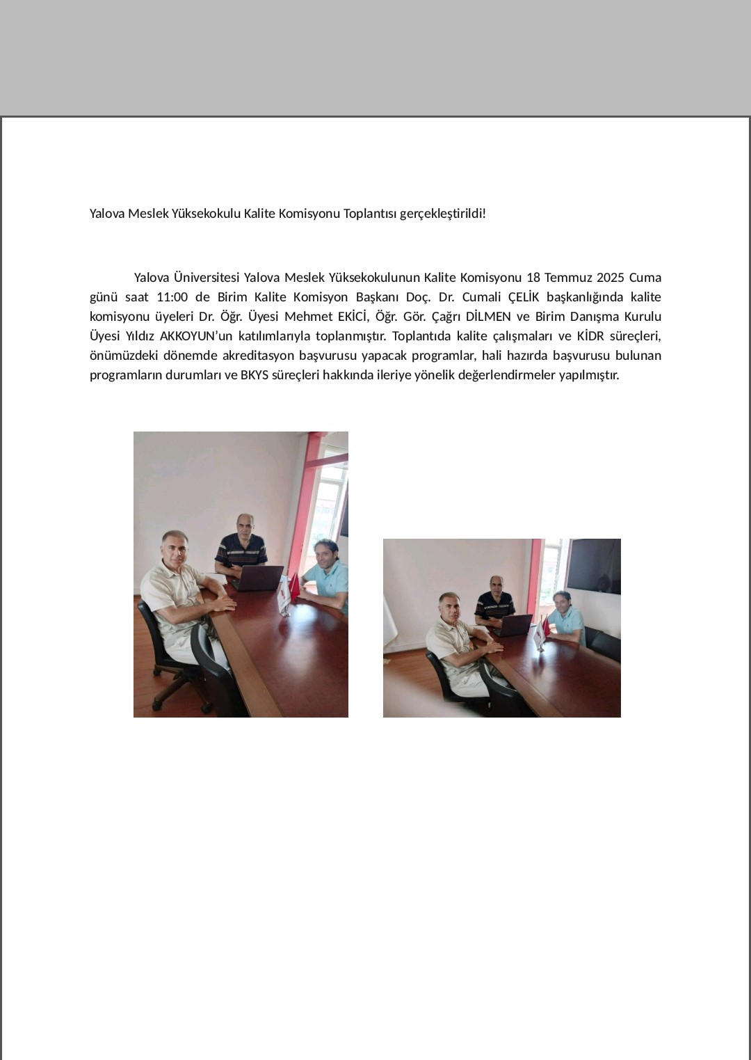 Yalova Üniversitesi Yalova Meslek Yüksekokulu Kalite Komisyonu 18 Temmuz 2025 , cuma günü saat 11:00 da toplanarak, gerekli değerlendirme ve çalışmalarını yapmıştır.